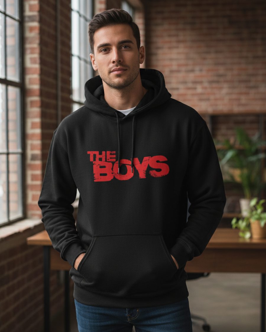 Step into the world of corrupt superheroes and vigilantes with this high-quality, unofficial The Boys logo hoodie. This black pullover features the show's iconic distressed logo, making it the ultimate fan apparel for anyone who loves the gritty superhero satire series. It's designed to keep you warm and cozy, whether you're heading out on a mission or settling in for a binge-watching session.